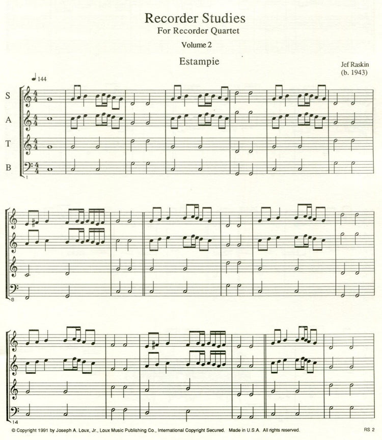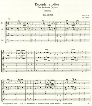*Three Studies for Recorder Quartet*. Written to provide recorder groups with varied and enjoyable pieces which at the same time assist in building ensemble performance technique.