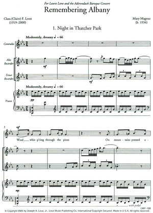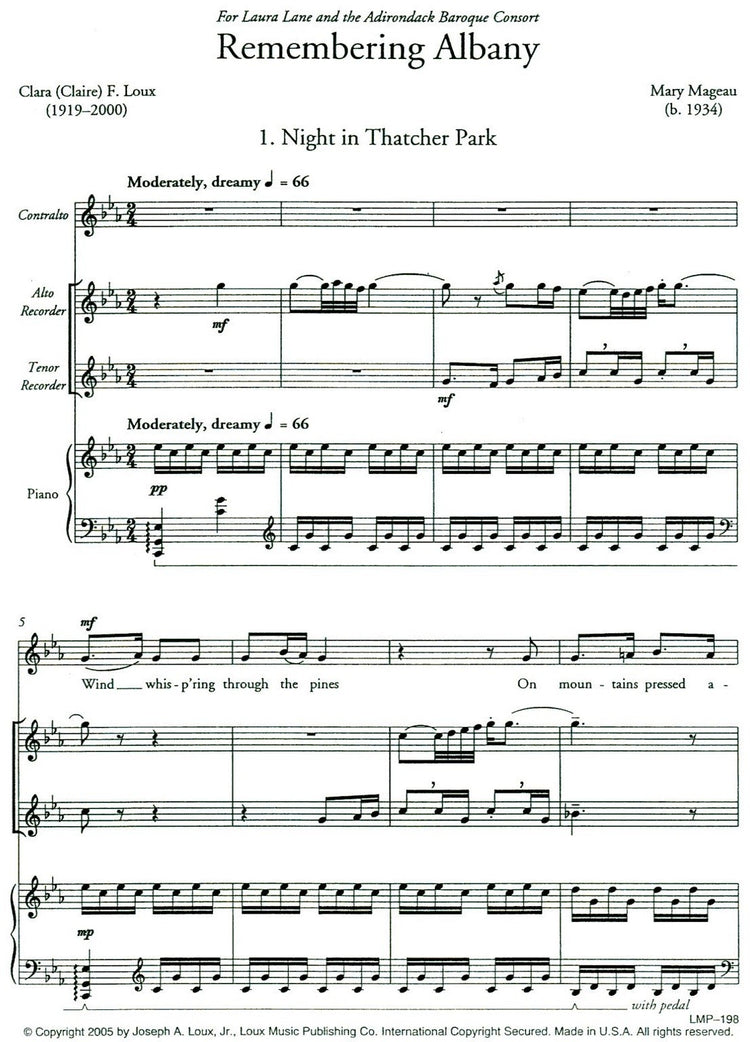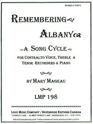Several years ago Dr Joseph Loux sent me a collection of beautiful oems, written by his late mother Claire Finkle Loux. As I was immediately attracted to her lyrical and expressive style of writing, the idea of composing a song cycle was suggested. My first setting of four poems, Seasonal Reflections, was scored for soprano voice, alto recorder and piano in 2003. A second song cycle, Remembering Albany, for contralto voice, alto and tenor recorders and piano was completed in July 2005. The poems all refer to well known places and buildings located in and around Albany, New York.