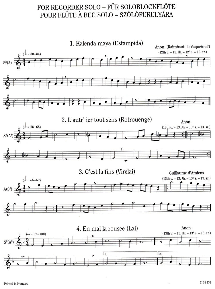 31 pieces for recorder solo: Four Troubadour Songs, Five medieval instrumental pieces, Eight French folksongs from the 15th and 16th centuries, Six songs with variations from the 17th Century - by Jacob van Eyck, Six airs, and Two Preludes.