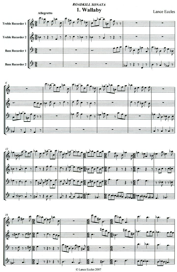 For 20 years, Lance Eccles was a member of the Reluctant Consort, a group based in Sydney, Australia. Most of his compositions have been written for this consort or for meetings of the Sydney Society of Recorder Players. Eccles is retired from his position as a senior lecturer in Chinese at Macquarie University. His current web site states that he is an "honorary senior research fellow in the Department of Ancient History at Macquaie University in Sydney, Australia"; see www.ocs.mq.edu.au/~leccles.