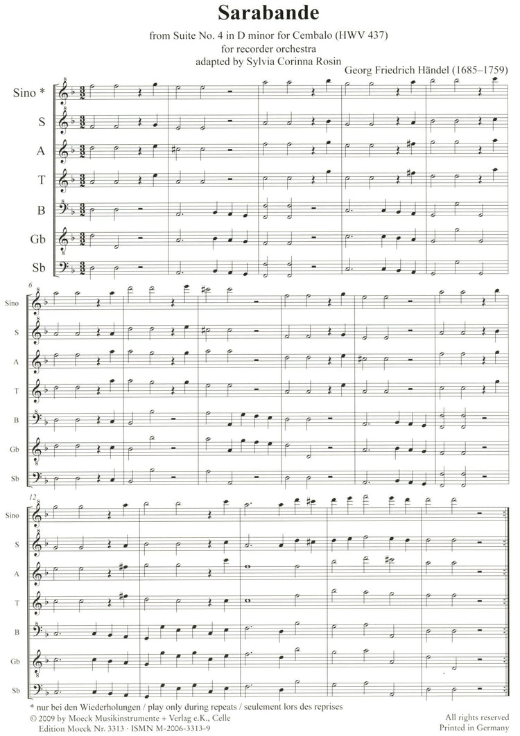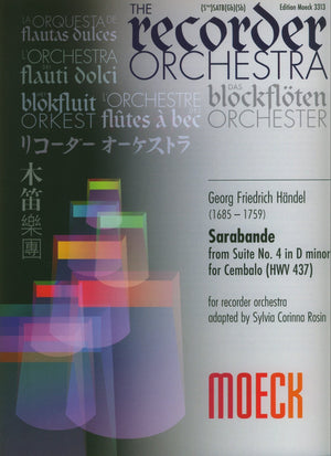 *Baroque Sarabande arranged for Recorder Orchestra.* The publisher allows photocopying of parts to assist larger ensembles. Includes introductory notes in French, German and English.