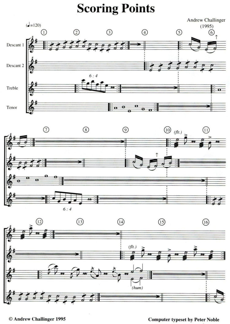 Rather less friendly material for beginners. Intended to introduce young players to a range of extended techniques. A series of interlocking patterns. Not as hard as it looks.