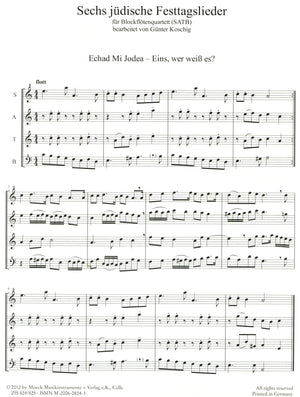 *Six Traditional Songs* arranged here for recorder quartet. Includes foreword in English, German and French.