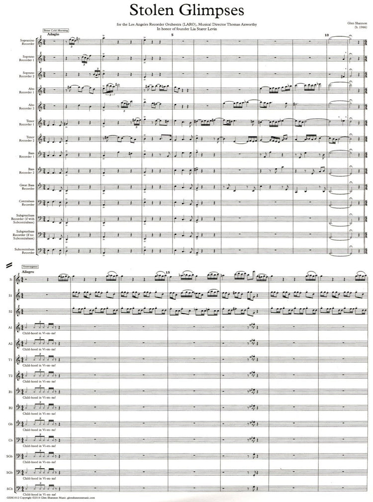 *Contemporary Work for Recorder Orchestra.* "Stolen Glimpses" was commissioned by the Los Angeles Recorder Orchestra in 2015 to celebrate the life of their founder, Lia Starer Levin. It is a series of musical vignettes representing some the places around the world that Lia has lived, performing and teaching music.