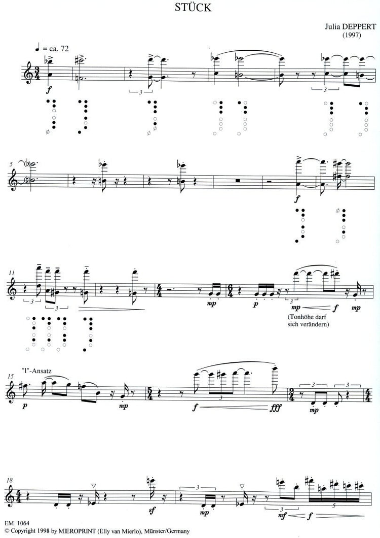 *Contemporary Piece.* Avant Garde techniques used with fingering guide throughout piece. Changing time signatures and keys. Extensive introductory and performance notes are included in German only.