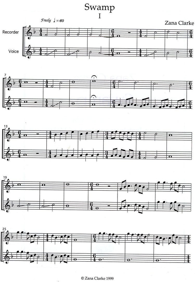 *Contemporary Piece.* Creates some interesting and sometimes surprising combinations of timbre and harmony through use of recorder and voice. VD