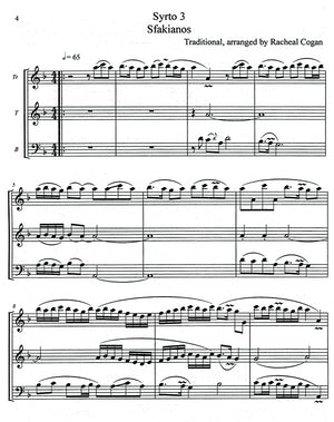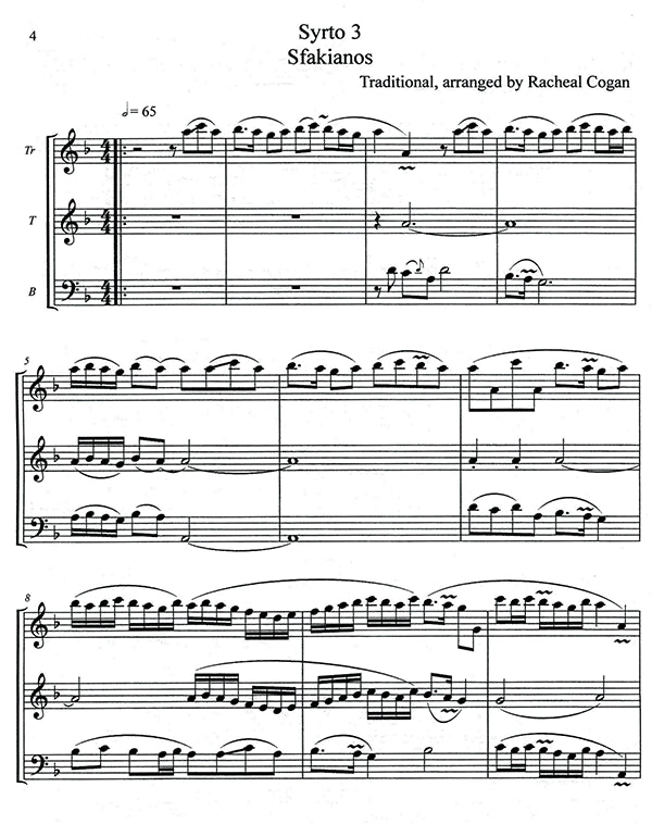 Greek and Turkish) music. Syrta is a trio in four short movements based on a form of music and dance from the island of Crete. The two outer movements are original, and the two internal ones are arrangements of traditional tunes. The compositions and arrangements are straightforward the melody is primarily in the alto, decorated by the other two players.