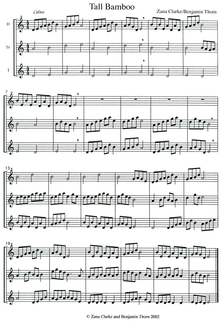 The opening song, Tall Bambo, introduces and cements the pentatonic material. It has a slow, dignified quaver movement in the descant over open fifth minims in the treble and tenor. The song is in Calmo quadruple time. Treble and tenor duet, then take up the melody at the fifth definitely in bamboo territory here - then all instruments play different segments of melody related material a gentle confusion of mainly quaver melody to the conclusion.
