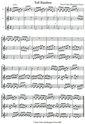 Tall Bamboo is a collection of four short songs in G pentatonic scale and is the third collaboration between Zana Clarke and Benjamin Thorn. Tall Bamboo, The Long Road, Red Lily, and Rice Paddy it's pretty clear we're in for a serving of eastern inspired sound. The songs are clever examples of creating a great deal from little - essentially the entire publication consists of the 5 pitches G, A, B, D and E. Naturally there is a strong sense of unity between the songs, but at the same time each song has its distinct identity due to Zana's talent for melody. The ensemble writing in each song is always rhythmic and melodic. The easy pace of these songs and limited pitch material make them ideal for the level 2-3 players.