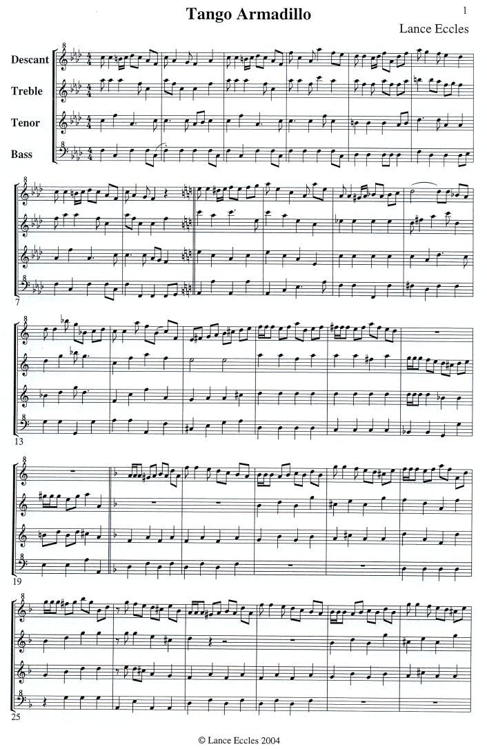 Tango Armadillo is a concert tango that roves through a variety of key centres. It is short, pleasant, and would be an attractive divertissement between longer pieces on a program. It is of lower moderate difficulty.