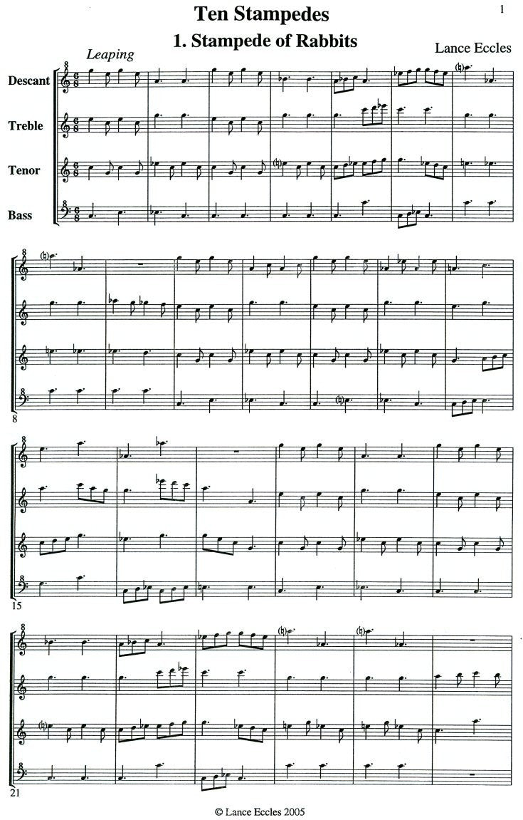 In the first piece, "Stampede of Rabbits," the performance instruction says "leaping," and that's exactly what most of the parts do most of the time. There is a middle section where the melody becomes stepwise and is passed between the soprano and alto recorders. Some leaps are augmented octaves, creating striking leaps into dissonance. Near the end, Eccles uses sequences in descending-fifths with seventh chords, emphasizing more dissonances.