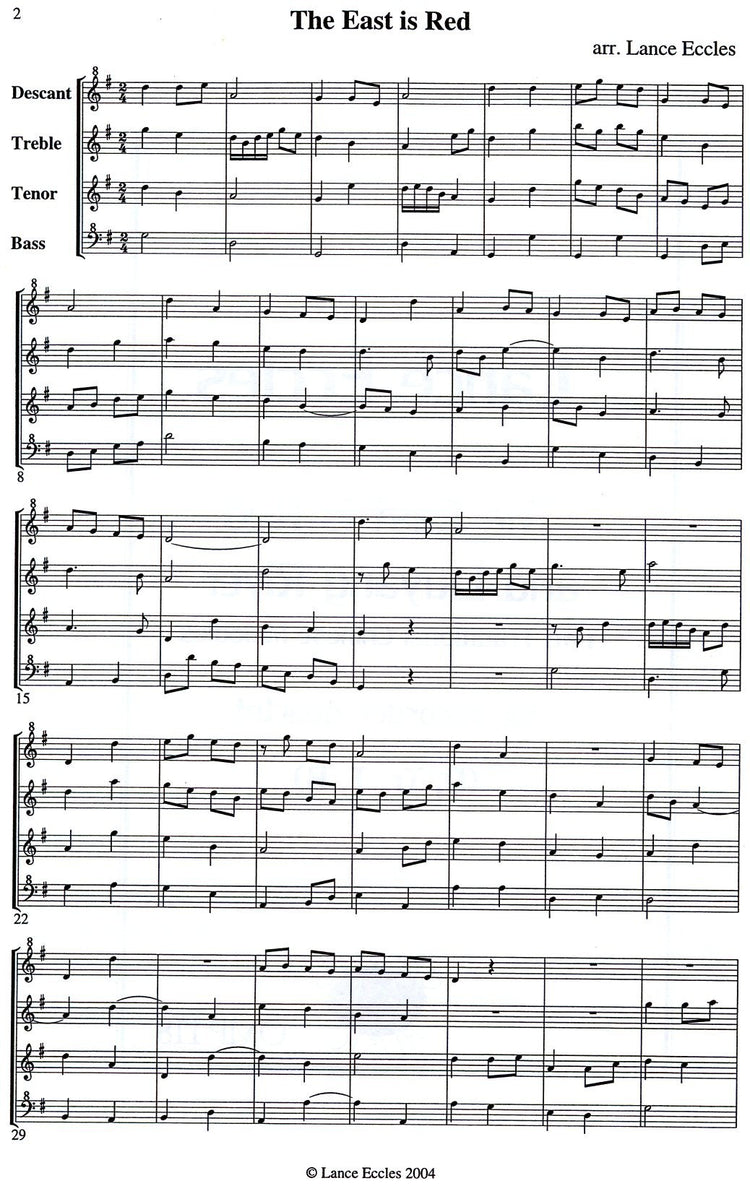 These collections were arranged by Lance Eccles, an Australian university lecturer in Chinese who also plays the recorder. The two Chinese collections (The East is Red and Liuyang River and Four Revolutionary Songs from Northwest China) comprise songs widely sung during the Cultural Revolution.