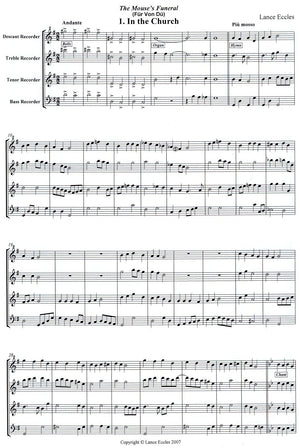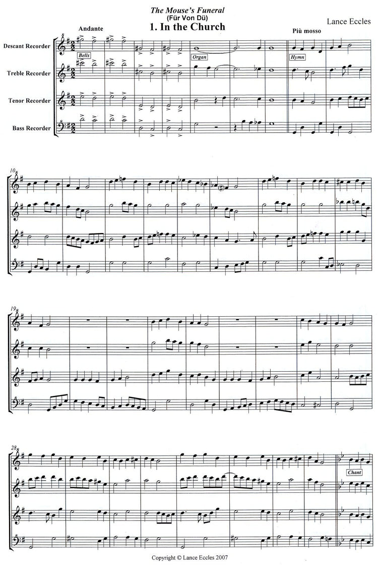 The Mouse's Funeral is also a programme piece in the three movements In the Church' opens with a very effective tolling of bells, followed by the organ softly playing, and leads into the first hymn. Next follows a chant in organum which introduces the Liturgy which is also interspersed with chants. A Eulogy follows and the final hymn finishes the movement. The instructions for 'Bell, organ, hymn' etc are printed on the score and on the descant part only, but it is a pity that they weren't reproduced on the other parts so that these players could enter into the mood of the piece as well. I am sure I heard a reference to Three Blind Mice' incorporated into the sighing of the mourners. The final movement, At the Wake', is a jovial piece which travels through several modulations and gathers rhythmic complexity as the mourners get more intoxicated. There are plenty of challenges in The Mouse's Funeral' to keep players on their toes.