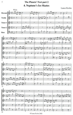 The Planets' Feet is a suite in five movements, published in two sets. Each movement has an amusing title based on the poetic conception of footwear for the planets. The first set contains the first three movements: "The Boots of Mars", "Venus' Silk Stockings", "Mercury's Joggers". The second set contains "Neptune's Ice Skates" and "Jupiter's Skateboard". As the titles imply, each movement has a contrasting musical character. They are extremely appealing character pieces of medium difficulty. It is a clever and useful suite that would add a witty dimension to a recital.