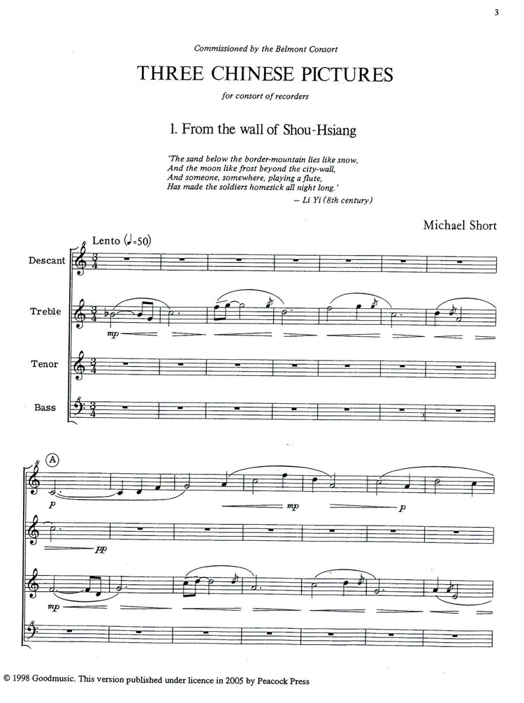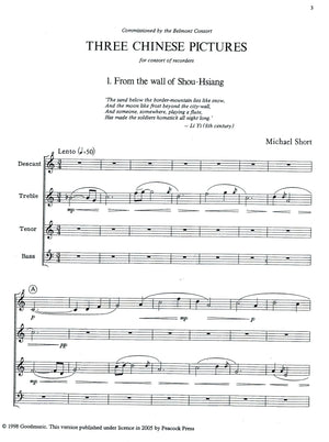 *Three Contemporary Pieces.* Uses some chromaticism. Includes Chinese poetry excerpts to create a mood.