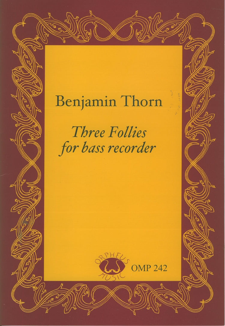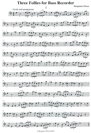 It is good to find a piece of original music for bass recorder which can be played by reasonably competent bass players, without having a diploma tucked under your belt. Benjamin Thorn's Three Follies are structured round the Follia ground bass and could be accompanied by a cello or viol playing that bass in G minor.