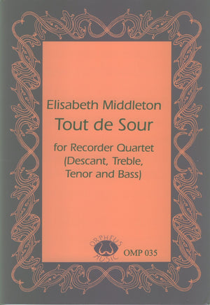 Tout de Sour, by Australian composer and educator ElisabethMiddleton, is a companion piece to her work Tour de Sweet, also for recorder quartet (OMP 013). Like Tour de Sweet, this work is in three brief movements, each with expression markings relating to sourness - "With acerbity", "With less acerbity", and "With more acerbity". Throughout the piece, "biting" sonorities and dissonances are used to good effect. There are no expression or phrasing marks except for dynamics. It is moderately easy, and the ensemble texture is almost entirely homophonic. It would be an excellent choice for a group wanting to "expand their harmonic palate" slightly without trying anything too difficult. Score and parts are easy to read. There are no page turns except between movements.