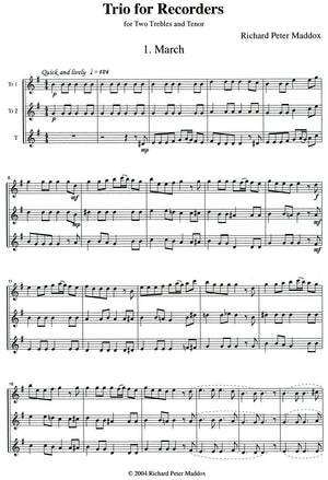 Trio for Recorders is in three short movements. "March" passes the jaunty melody among all three instruments, accompanied by an insistent snare drum-like figuration in the other recorders. "Slow Dance" is elegant, with a gentle swaying motion in ¾ time, "Stepping Quick" is light and wryly humorous, maintaining an energetic drive throughout.