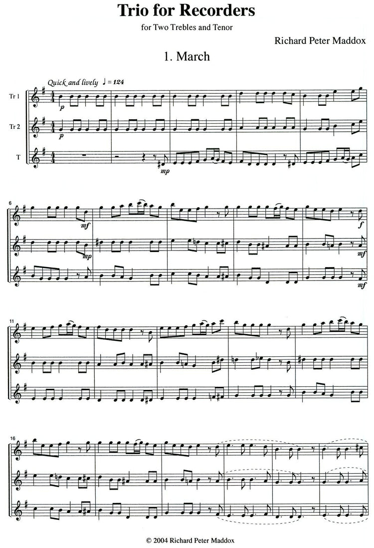 These is a lot of recorder music coming out of Australia at the moment, most of which seems to have originated in the Armidale area. Richard Peter Maddox is from this area and conducts the Armidale Vocal Ensemble and the Chapel Choir at the Armidale School. He already has several pieces published by Orpheus, and his latest piece is Trio for Recorders which is scored for two trebles and tenor.