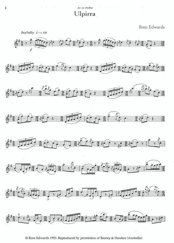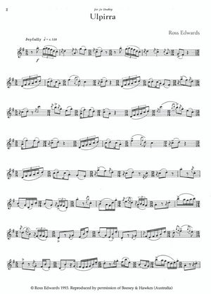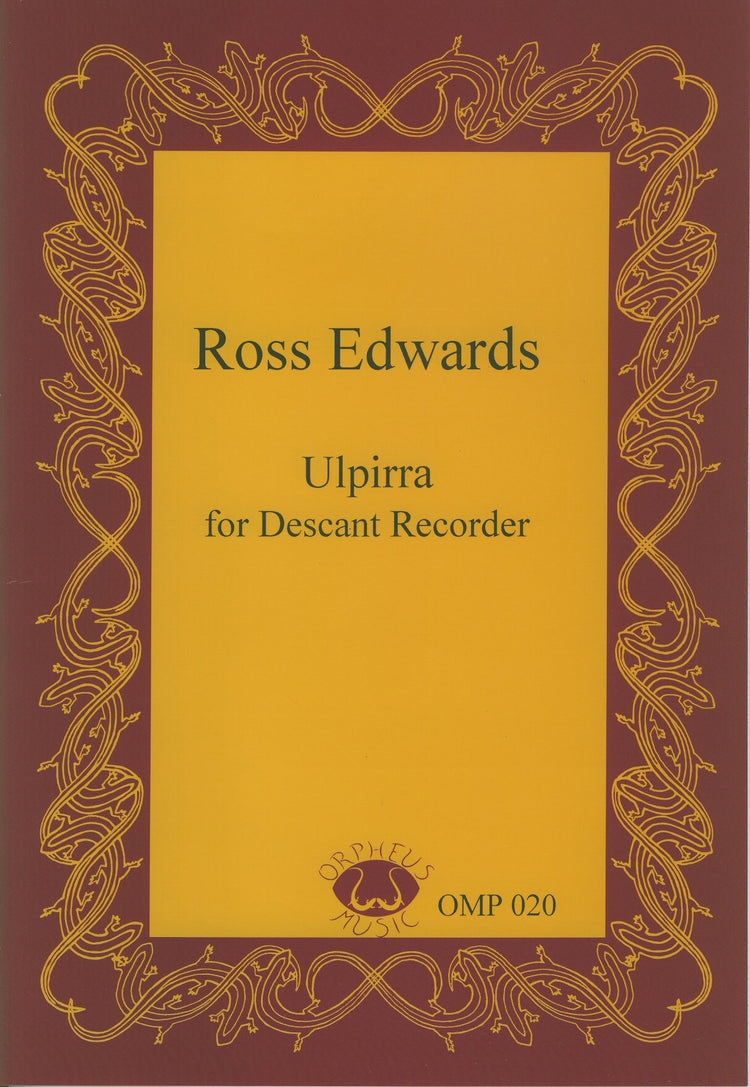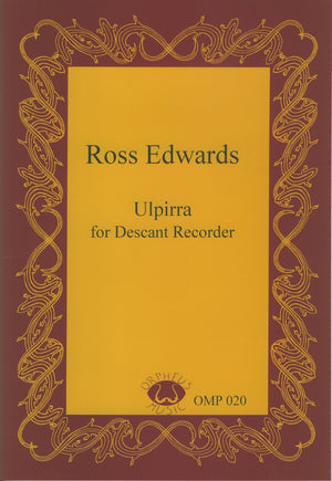 Ulpirra is a jazzy solo for descant recorder by Ross Edwards called Ulpirra. The catalogue grades it difficult, probably on account of its lively pave, ever-changing time-signatures (only four different ones) and frequent acciaccaturas, not always close to the notes they grace. But there are no torturing dynamic demands - just the mark 'F' at the start, and no modern techniques to contend with. The tempo word is 'Joyfully' and the piece is just that - a joyful jazzy romp lasting about a minute and a half. The music is neatly constructed, the crisp, pithy phrases uniting to form a jubilant flurry of excitement.