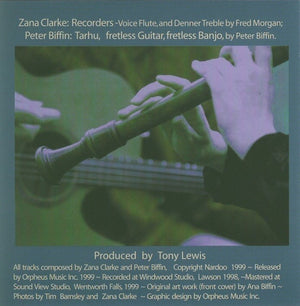 The pieces are short, ranging from two to five minutes, and employ various combinations of treble recorder and voice flute, fretless guitar, fretless banjo and tarhu. A variety of styles may be detected: the music tends generally towards the folk tradition in flavour, but a distinctively international folk flavour at that. Several tracks owe much to Indian music, while lament (no.3) is more reminiscent of the spaghetti Western styles. Jo Jo (no.8) recalls the British Isles' folk tradition, which is inevitably one of the influences on Australian music, and has interesting divisions in the guitar accompaniment.
