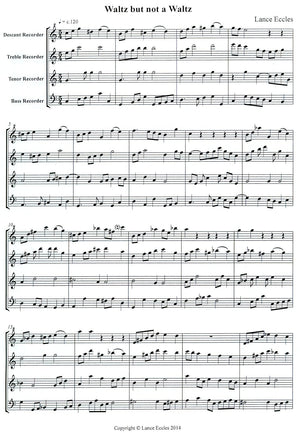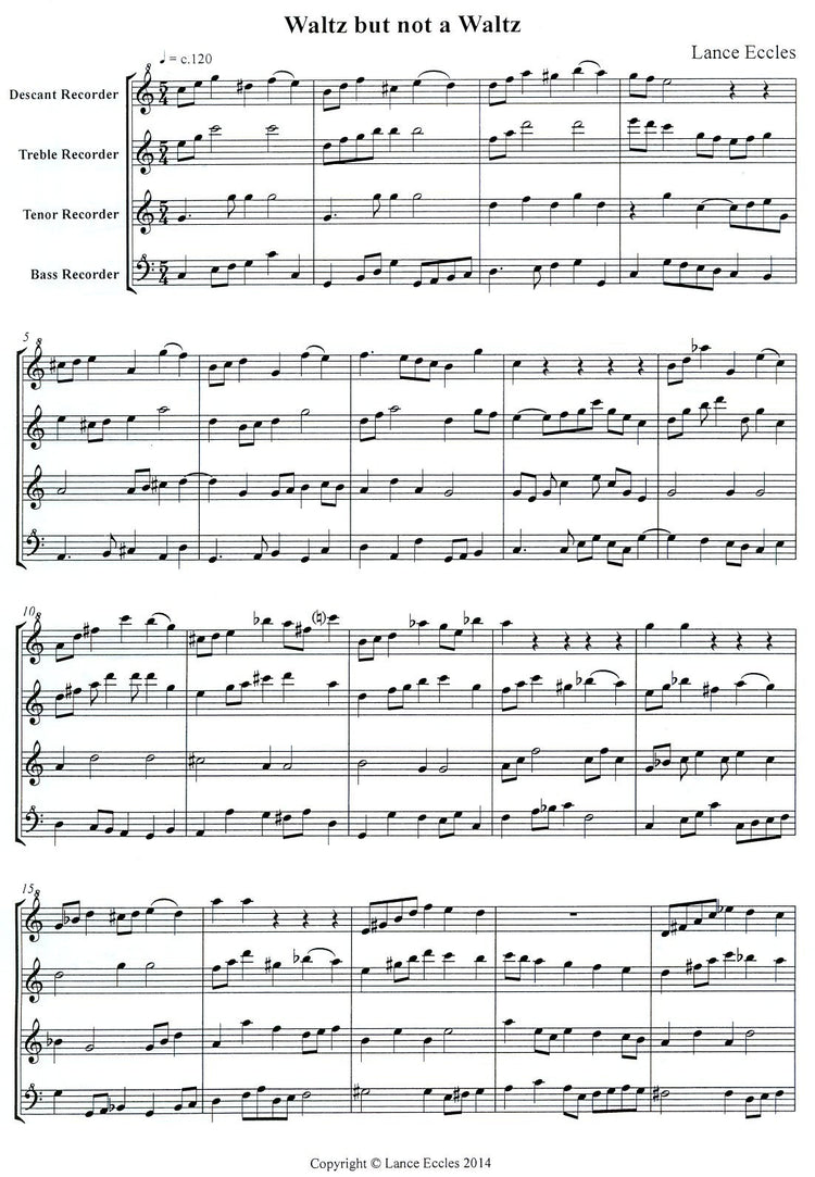This contemporary piece is "Not a Waltz" because its meter is 5/4, grouped as 3+2. While it would be hard to waltz to this piece, it depicts quite a lot of motion. A mischievous motive bounces through the piece. The key signature alternates between C major and minor; the meter and tempo do not vary over the three-minute playing time. My ensemble found it a little more demanding than its "Moderate" grade on the Orpheus web site. Because the lines move more by leaps than stepwise, staying in C fingerings or in F fingerings may be more difficult than usual.