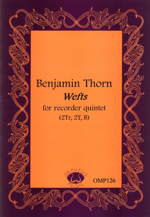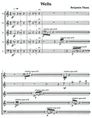 Benjamin Thorn is perpetually a unique musician. Wefts (an archaic word meaning "weaves") is a work that mixes rapid, randomly played and continually repeated note groups with melodies. During several parts of the piece, different melodic lines are heard at the same time, intertwining and crossing each other's ranges. What holds the piece together is its modality that is based on some of Olivier Messiaen's modes of limited transposability. The result is a simultaneous feeling of restlessness and stasis.