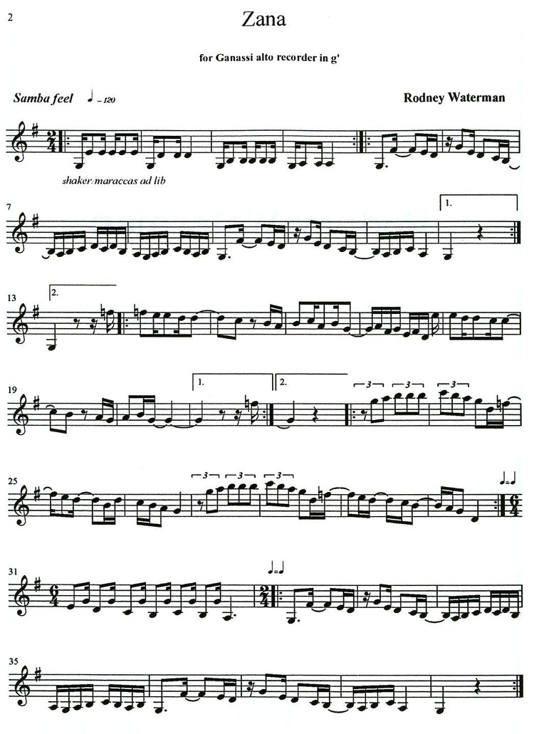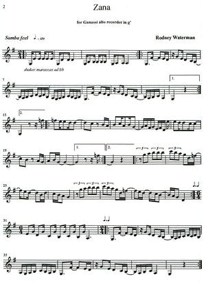 Zana began life as an improvisation and was inspired by "the beauty and possibilities" of Fred Morgan's Ganassi altos that the composer played whilst working as a tester in Morgan's workshop. Waterman has infused his love of the Ganassi recorder with a Brazilian flavour and produced a sunny Samba-type piece for alto in g', although an alternative version in f' is also supplied.